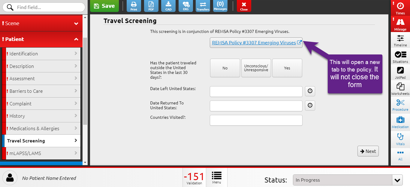 The REMSIS system now allows for Hyperlink buttons to be added to EMS Forms. REMSA Policy #3307 was added for direct reference to REMSA policy is the use of this Riverside County specific screening tool for 2019-nCoV patients.