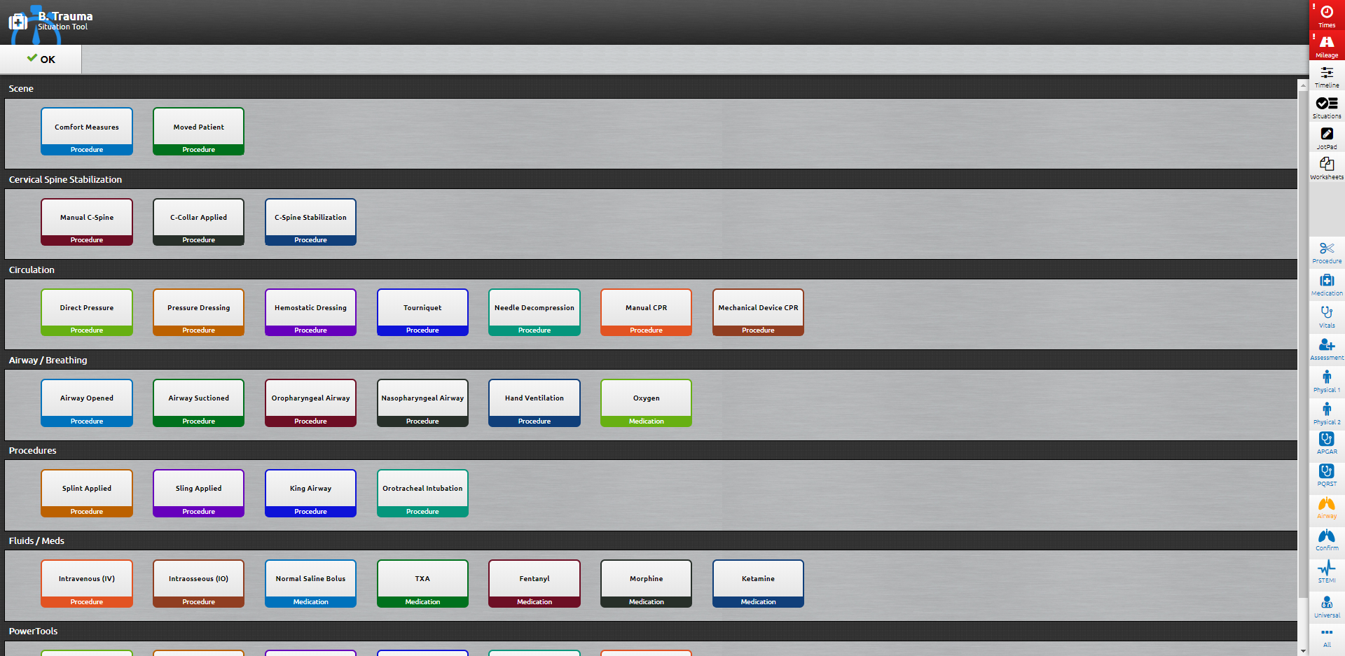 - Amended Trauma Situation tool for formatting and added Quikclot hemostatic dressing, Simplified the 250ml NS Bolus in Circulation, and added Ketamine as medication for use in trauma tool. Deleted not used buttons for easier selection during critical documentation times.